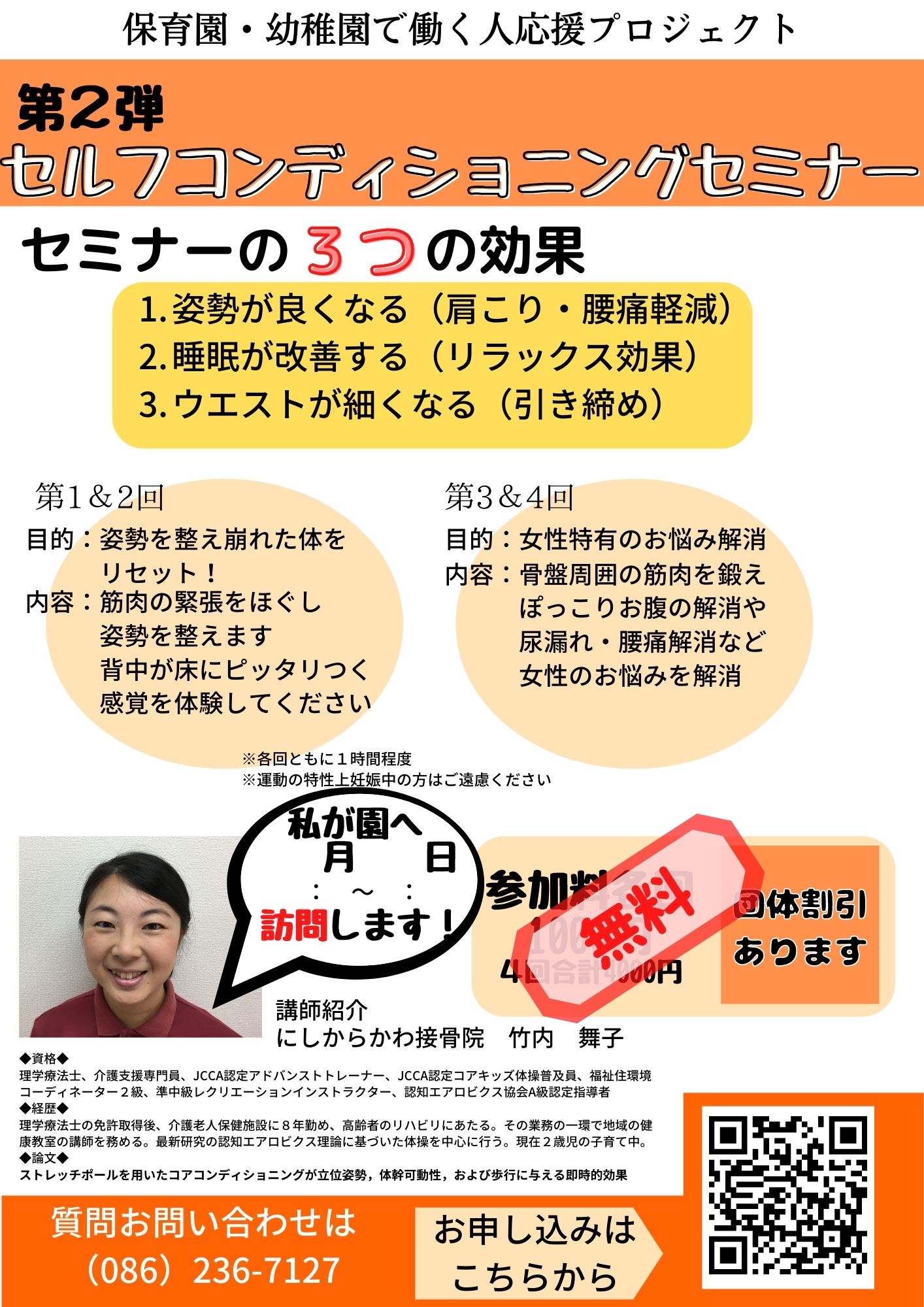 保育園・こども園・幼稚園の先生向けに、体の使い方を改善して、腰痛や肩こりを軽減してもらうセミナーを企画してます。
