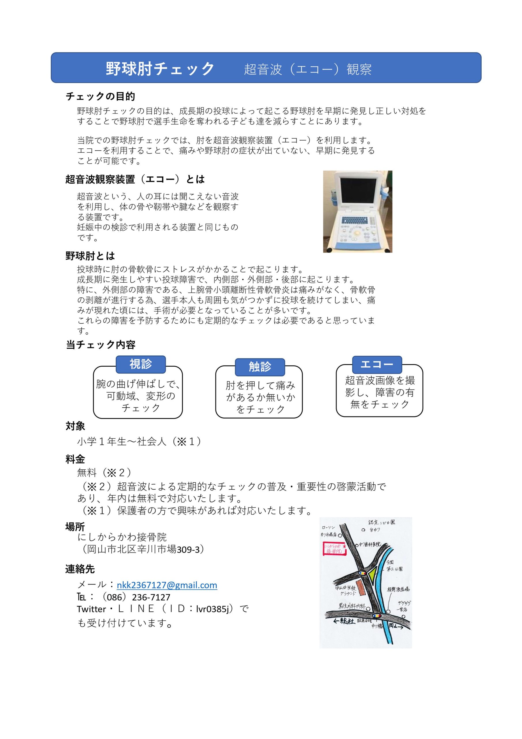 にしからかわ接骨院では、「超音波観察装置(エコー)」を導入しています。 エコーは、野球肘を早期発見するうえでとても重要な装置になります。この機会に、是非、自分の体を知るきっかけにしてください。 FacebookXBlueskyCopy